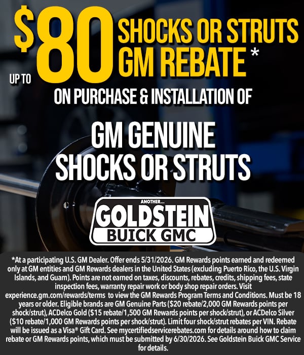 *At a participating U.S. GM Dealer. Offer ends 5/31/2026. GM Rewards points earned and redeemed only at GM entities and GM Rewards dealers in the United States (excluding Puerto Rico, the U.S. Virgin Islands, and Guam). Points are not earned on taxes, discounts, rebates, credits, shipping fees, state inspection fees, warranty repair work or body shop repair orders. Visit experience.gm.com/rewards/terms to view the GM Rewards Program Terms and Conditions. Must be 18 years or older. Eligible brands are GM Genuine Parts ($20 rebate/2,000 GM Rewards points per shock/strut), ACDelco Gold ($15 rebate/1,500 GM Rewards points per shock/strut), or ACDelco Silver ($10 rebate/1,000 GM Rewards points per shock/strut). Limit four shock/strut rebates per VIN. Rebate will be issued as a Visa® Gift Card. See mycertifiedservicerebates.com for details around how to claim rebate or GM Rewards points, which must be submitted by 6/30/2026. See Goldstein Buick GMC Service for details.