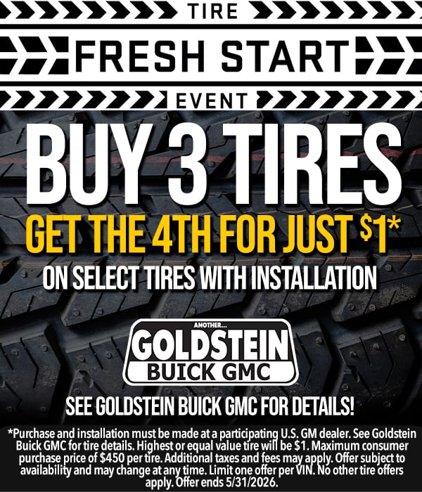 *Purchase and installation must be made at a participating U.S. GM dealer. See Goldstein Buick GMC for tire details. Highest or equal value tire will be $1. Maximum consumer purchase price of $450 per tire. Additional taxes and fees may apply. Offer subject to availability and may change at any time. Limit one offer per VIN. No other tire offers apply. Offer ends 5/31/2026.
