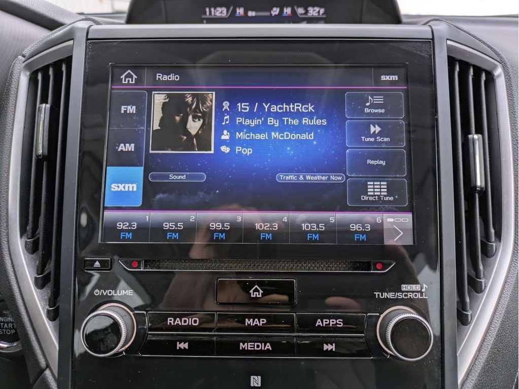 - Radio: Subaru Starlink 8.0" Multimedia Plus System -inc: AM/FM stereo HD Radio w/single-disc CD player w/MP3/WMA/CRR/RW file capability, multi-touch gesture high resolution display, voice activated controls, Bluetooth audio streaming connectivity and hands-free phone connectivity, Bluetooth hands-free SMS text messaging connectivity, Near Field Communication (NFC), iPod control capability, rear-vision camera display, SiriusXM All Access radio and Travel Link (4 months free trial/subscription required after), smartphone integration: AHA, Android Auto, CarPlay and Pandora, Starlink cloud applications: refer to subaru.com for app availability, steering wheel controls, 6 speakers, 3.5mm auxiliary input jack, dual USB input ports and body color roof mounted antenna