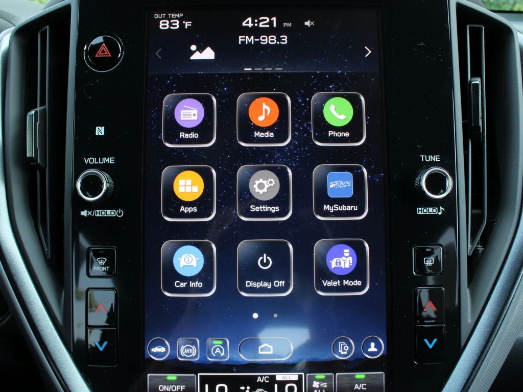 - Radio: Subaru STARLINK 11.6" Multimedia Plus Sys -inc: AM/FM stereo, HD Radio, multi-touch gesture high resolution display screen, voice activated controls, Bluetooth audio streaming and hands-free phone connectivity, Bluetooth hands-free SMS text messaging connectivity, iPod control capability, SiriusXM All Access Radio (4 months free trial included/subscription required after), SiriusXM Travel Link (4 months free trial included/subscription required after), smartphone integration: Android Auto and Apple CarPlay w/full screen view and wireless connection, USB and Over The Air (OTA) audio system update, steering wheel audio system and Bluetooth control switches, 6 speakers (2 dash panel tweeter, 2 front door and 2 rear door), illuminated 3.5mm auxiliary input jack, illuminated front USB A and C input/charge ports and illuminated rear USB A and C charge ports