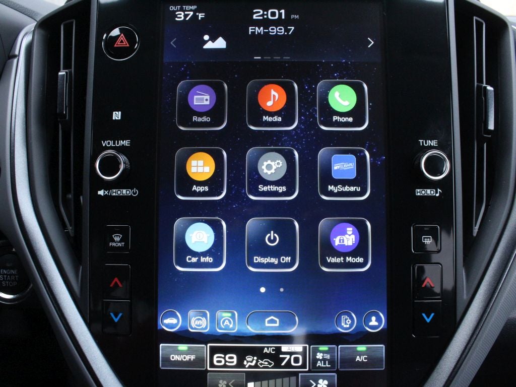 - Radio: Subaru 11.6" Multimedia Plus System -inc: AM/FM stereo, HD Radio, multi-touch gesture high resolution display screen, voice activated controls, Bluetooth audio streaming and hands-free phone connectivity, Bluetooth hands-free SMS text messaging connectivity, iPod control capability, SiriusXM w/360L (4 months free trial included/subscription required after), SiriusXM Travel Link (4 months free trial included/subscription required after), smartphone integration: Android Auto and Apple CarPlay w/full screen view and wireless connection, USB and Over The Air (OTA) audio system update, steering wheel audio system and Bluetooth control switches, 6 speakers (2 dash panel tweeter, 2 front door and 2 rear door), illuminated 3.5mm auxiliary input jack, illuminated front USB A and C input/charge ports and illuminated rear USB A and C charge ports