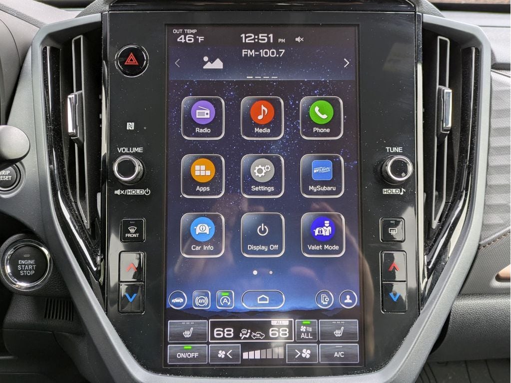 - Radio: Subaru 11.6" Multimedia Plus System -inc: valet mode, integrated center information display, AM/FM stereo HD Radio, multi-touch gesture high resolution display screen, voice activated controls, Bluetooth audio streaming and hands-free phone connectivity w/SMS text messaging connectivity (refer to subaru.com for cell phone compatibility), iPod control capability, SiriusXM w/360L (4 months free trial/subscription required after), SiriusXM Travel Link (3 years free trial/subscription required after), smartphone integration for Android Auto and Apple CarPlay w/full screen view and wireless connection, USB and Over The Air (OTA) audio system update, steering wheel control switches for audio and Bluetooth, 6 speakers, 3.5mm auxiliary input jack and roof mounted audio and satellite antenna